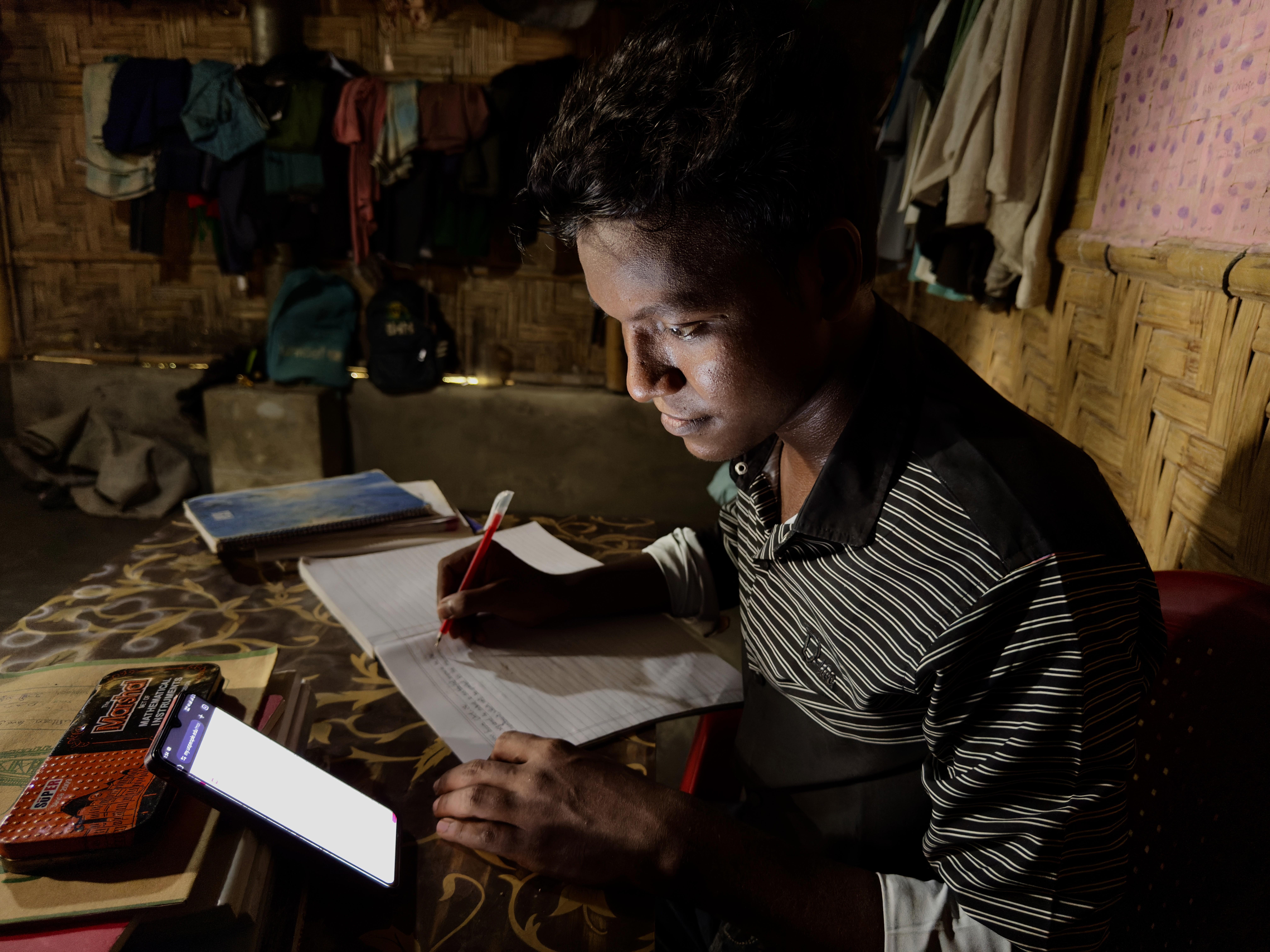Yet Ayas was determined not to let displacement end his education. A year later, he was able to reconnect with his former teachers who had also sought refuge in the camps in Bangladesh. Within no time, Ayas joined small private study sessions, continuing his learning informally for six to seven months. Soon after, he discovered the power of online learning - through social media and YouTube, Ayas began teaching himself English, and by 2022 he had completed numerous free online courses. For paid ones, he contacted providers directly, explained his vulnerable situation, and secured access.