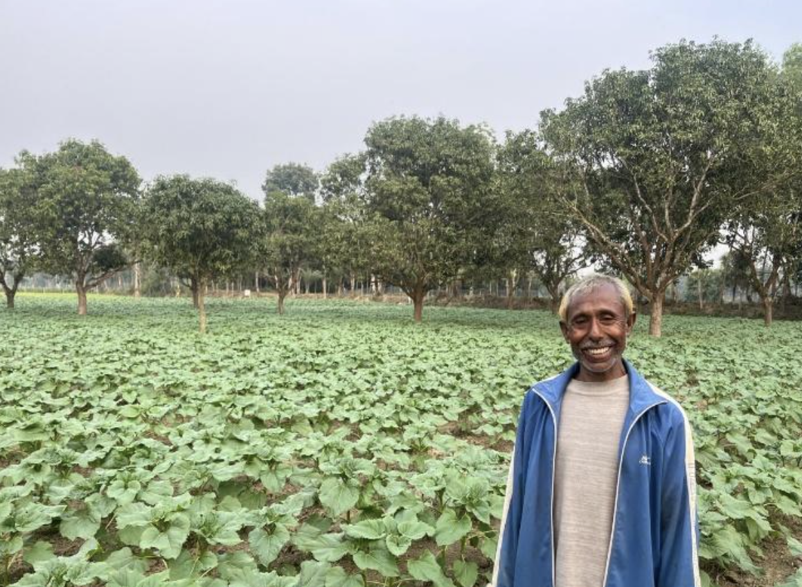 Abdul Malek, a mango farmer from Tarulia village in Satkhira, struggled with declining returns as salinity and lack of irrigation left his orchard fallow for over a decade. Through CARE Bangladesh’s HSBC-funded SURJAMONI project, he received training and technical support to introduce sunflower cultivation on 33 decimals of unused land. This yielded 230 kg of sunflower seeds, earning him 16,100 BDT in one season. “I never imagined sunflowers could grow here,” he shared with pride. Malek now plans to continue sunflower farming, demonstrating how SURJAMONI is helping farmers revive unproductive lands, diversify income, and build resilience in coastal areas.