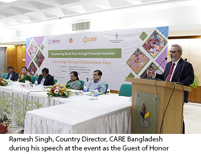 Ramesh Singh, Country Director of CARE Bangladesh, graced the event as the guest of honor and he emphasized on evidence generation an important aspect to reach out to the rural poor and extreme poor. He also mentioned that inviting academia to collaborate on more research for the financial inclusion of the poor is necessary.