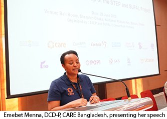 The workshop began with an inaugural speech by Emebet Menna, Deputy Country Director – Program, CARE Bangladesh. She remarked, “SUFAL and STEP have moved beyond traditional disaster response toward Anticipatory Action, reaching marginalized communities across northern and southern regions. Today’s workshop gives us the opportunity to reflect on our journey, share achievements, and learn from practical experience. We thank all our guests for their continued support and interest in the next steps.”