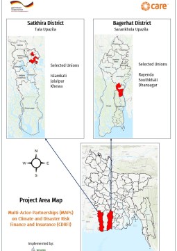 CARE Bangladesh and its partner AOSED-An Organization for Socio-Economic Development are implementing the BMZ funded 3-year ‘Multi-Actor-Partnerships on Climate and Disaster Risk Finance and Insurance (MAP CDRFI)’ project in the southwest coastal region of Bangladesh since July 2023. The MAP-CDRFI is led by CARE Germany in cooperation with Germanwatch and is a multi-country initiative in the Caribbean (Antigua and Barbuda, Barbados, Grenada, Dominica, St. Lucia), Malawi, Madagascar, Senegal, Philippines, Sri Lanka, and Bangladesh with a regional and global focus. The InsuResilience Global Partnership (IGP) which has been evolved into the ‘Global Shield against Climate Risks’, looks for a more comprehensive application through this multi-country project considering poverty focused principles in a way that the CDRFI mechanisms established or under design. The project focuses on piloting, advancing and scaling up approaches which are adapted to the needs of poor and vulnerable populations and are poverty-focused, gender-equitable and human rights-based. The aim of the project is to strengthen the structures, coordination and networking of MAP cooperating organizations and partners, to promote a just climate risk financing mechanism nationally and internationally with insights and recommendations from the affected community, public sector, duty bearers, academia and researchers, civil society, NGOs and related private sector representatives from the sub-national level.